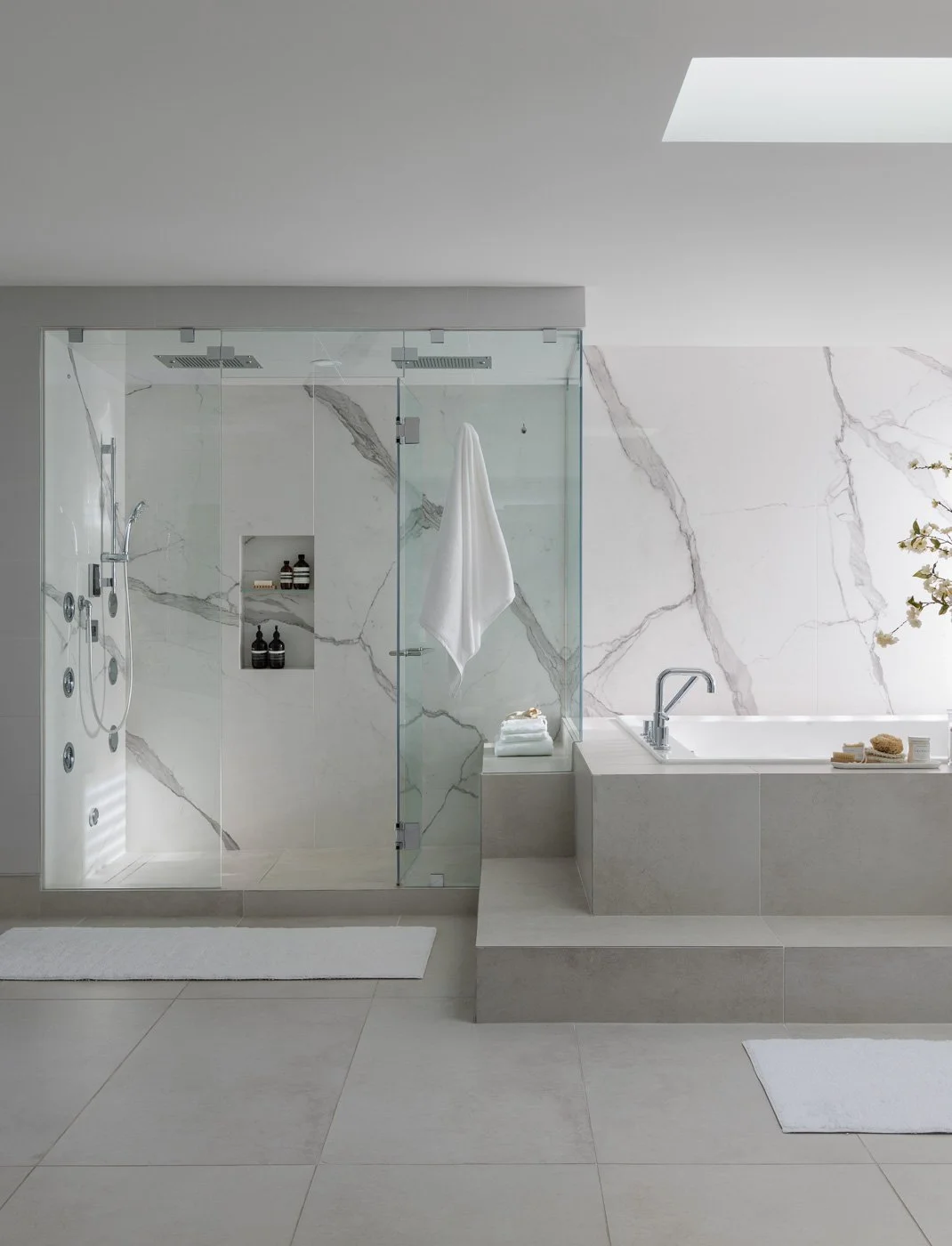 Evoking the minimalist beauty of Mid-century Scandinavian spa style, we fully embraced this for our primary ensuite bathroom. With an open layout, vein-match tiled walls, a chromatherapy steam shower, an oversized soaker tub, personalized makeup vanity, carefully curated selections and custom design details throughout. By adding in two skylights, this allowed for natural light to envelop the space and energize this bathroom.